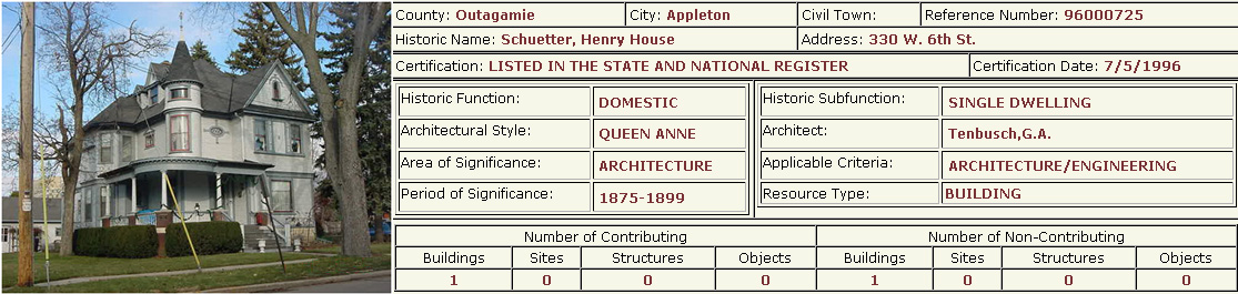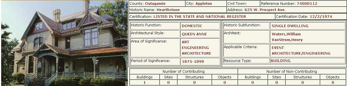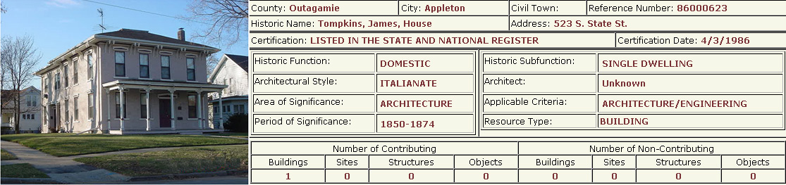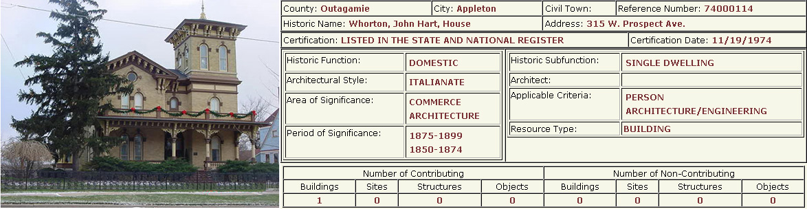 Several buildings and one district in the Old Third Ward are listed on the state and national Register of Historic Places. The following information was taken from the Wisconsin State Historical Society's Wisconsin National Register of Historic Places. Of the twenty entries from Appleton listed in this registry, five are located in the Old Third Ward.